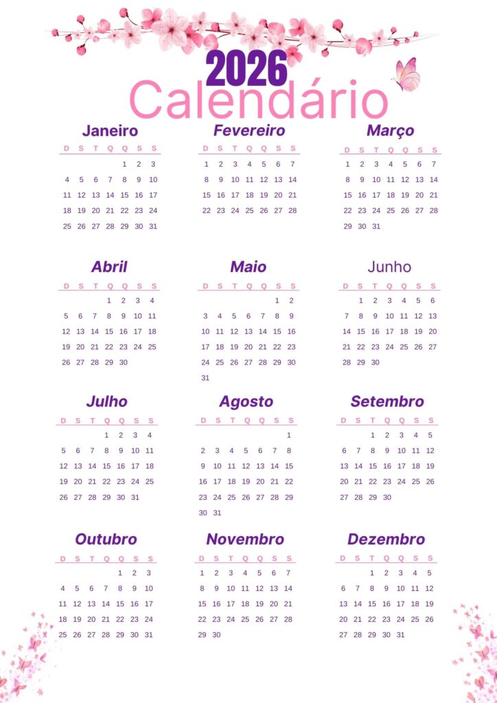 Calendário 2026 Grátis para Imprimir: Baixe em PDF e JPG e Organize Seu Ano!