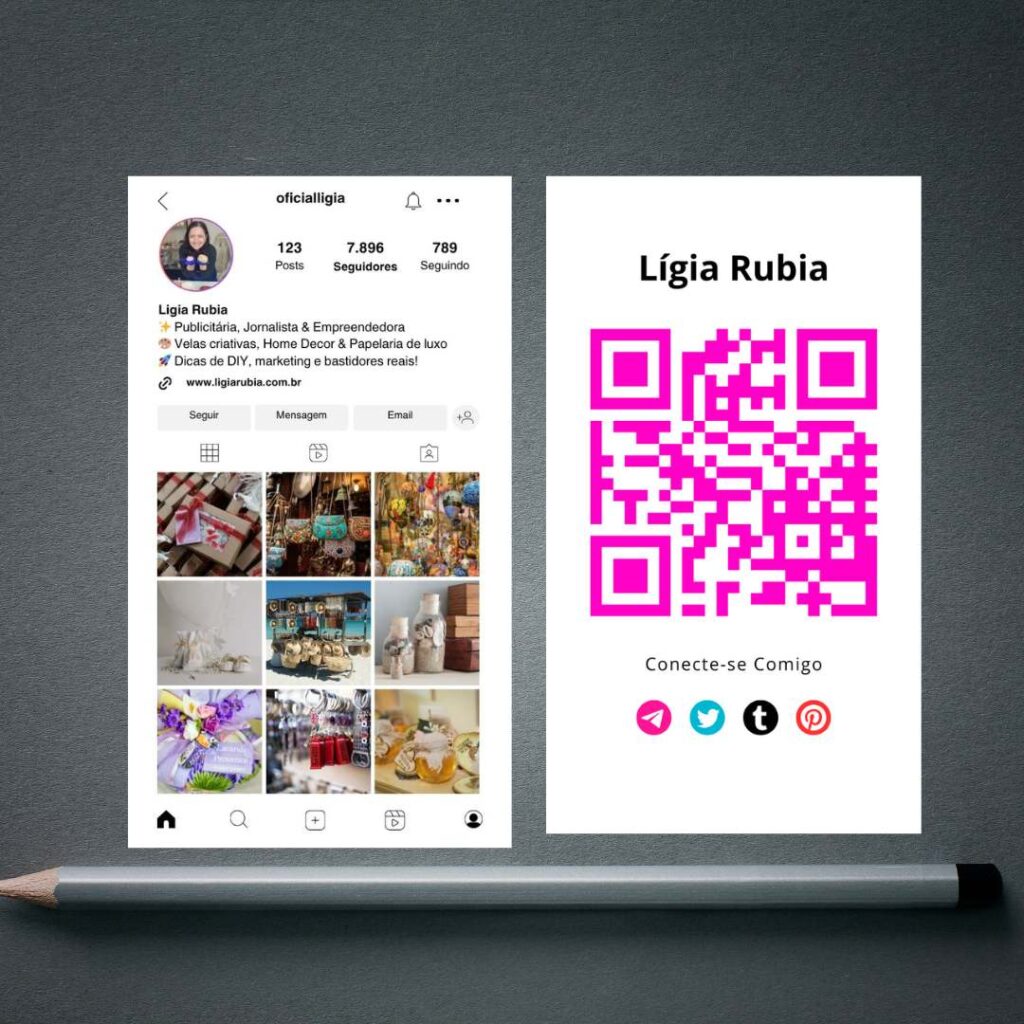 Aqui é a Lígia Rubia, sua mentora digital, publicitária e artesã. Hoje vou te ensinar, de forma prática e detalhada, como compartilhar, salvar e imprimir seu cartão de visita digital modelo Instagram – inclusive como imprimir em casa, para você estar preparado(a) em qualquer situação.
