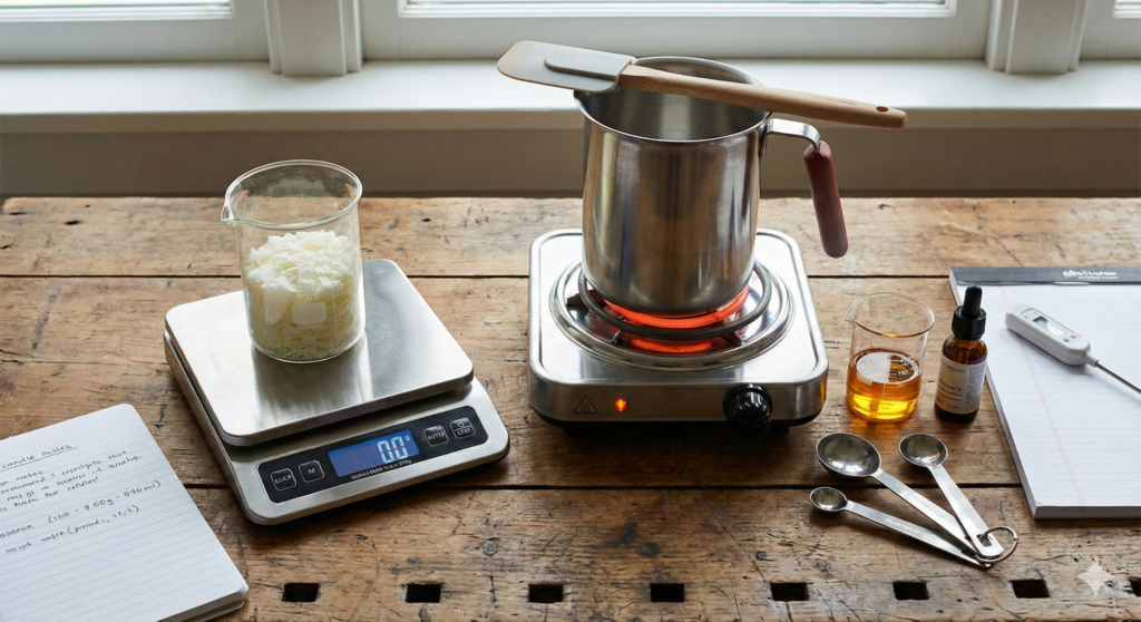 Na gastronomia (e na velaria!), a organização é tudo. Antes de ligar o fogão, deixe tudo separado na bancada. Se você correr para buscar o termômetro com a cera no fogo, ela vai passar do ponto.